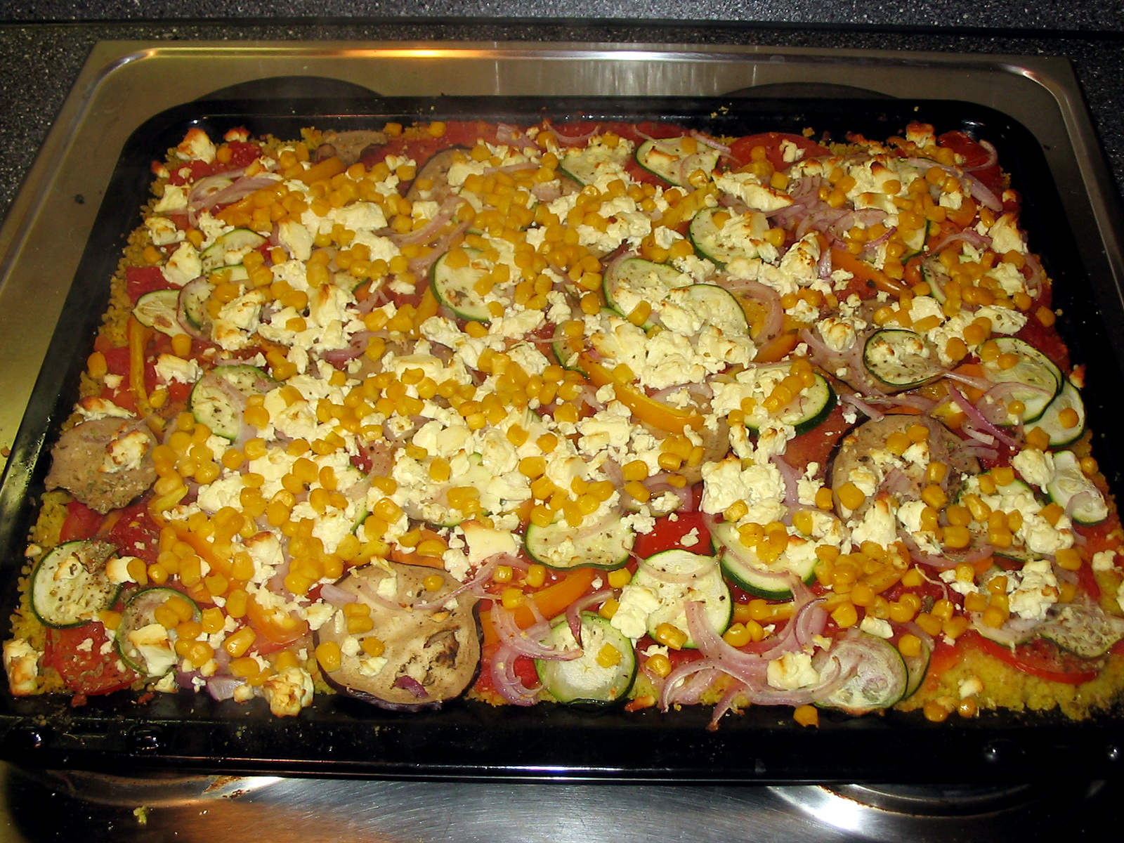 Aus den Dosentomaten, dem Knoblauch, den Chillis und den Gewürzen eine Sauce herstellen und auf die Polentamasse streichen. Tomaten, Karotten, Zucchini, Aubergine und Zwiebel darauf verteilen. Etwas Oregano, Salz und Pfeffer drueber streuen. Feta in der Hand zerquetschen und über die Pizza bröseln. Im Backofen backen, bis das Gemüse und der Käse Farbe annehmen. Dann ein wenig Zitronensaft drueber traeufeln und feddisch.