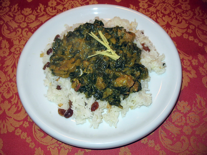 Das Ghee in einem Topf erhitzen, die Zwiebeln darin in 1-2 Minuten hellbraun anbraten, Ingwer-Knoblauch-Paste und das Fleisch zugeben und unter Rühren 5-7 Minuten anbraten. Koriander, Kreuzkümmel, Kurkuma, Chilipulver und Joghurt unter das Fleisch rühren, salzen und 6-8 Minuten unter Rühren kochen lassen. Den Spinat zugeben und zugedeckt bei schwacher Hitze 35-40 Minuten köcheln lassen. Dabei gelegentlich umrühren und ggf. etwas Wasser angießen.