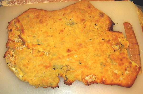 Das sollte eigentlich Paneer Kulcha werden, ein Hefeteigfladen mit Frischkäse gefüllt. Nur beim ersten Versuch ging Trockenhefe nicht auf und beim zweiten hatten wir erst gar keine Hefe im Haus. Dafür hatte ich ein Rezept gefunden, wo der Teig mit Joghurt angerührt wird und dann 8 Stunden zieht. Leider war der Hunger zu gross und wir mussten den Back-Versuch schon vorher wagen. Geschmacklich war es voll ok, man hätte es nur auch prima als Wurfgeschoss einsetzen koennen. Fazit: Pls do not try this at home ;-)