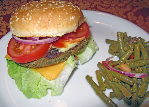 Die halbierten Semmeln eventuell aufbacken. Die Innenseiten mit Ketchup und Senf bestreichen. Dann kann der Burger nach Geschmack befüllt werden - mit Tomaten, Zwiebelscheiben, Salat, Käse und natürlich dem Kichererbsen-Walnuss-Pflanzerl.
