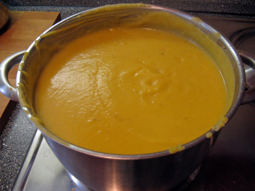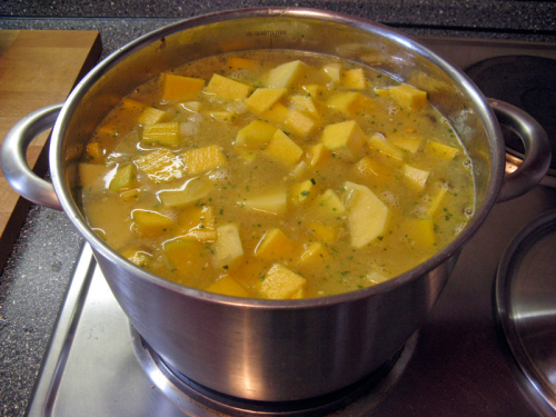 Vom Herd nehmen und etwas auskühlen lassen, etwa 5-10 Minuten, bis man die Masse anfassen kann.