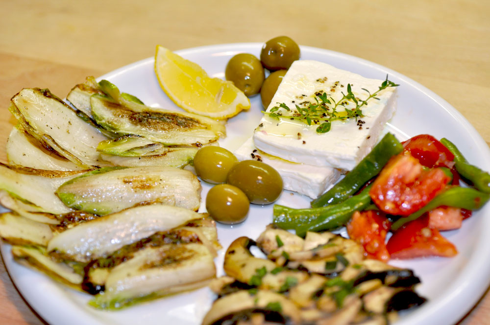 ... und dazu Oliven und ein knuspriges Bauernbrot mit Butter oder Frischkäse!