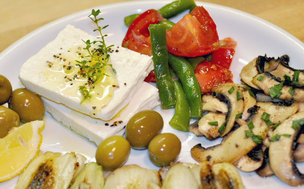Schafsmilchfeta mit Olivenöl, grobem Pfeffer und Zitronenthymian
