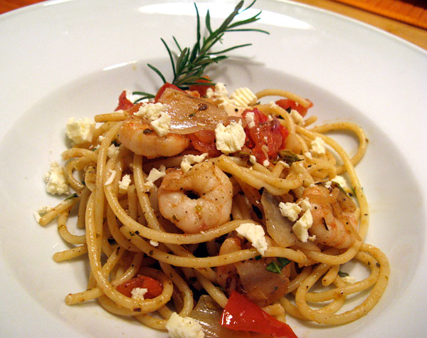 Spaghetti mit Garnelen, gebratenem Chicoree, Tomaten, Feta und Oliven in leichter Zitronen-Kräuter-Sauce